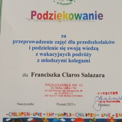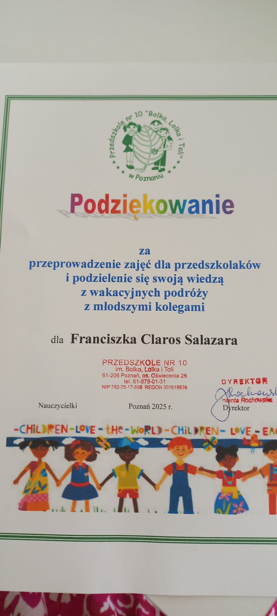 Wspaniałemu prelegentowi i podróżnikowi za przeprowadzone zajęcia podziękowała dyplomem pani dyrektorka, a panie nauczycielki i przedszkolaki gromkimi brawami.