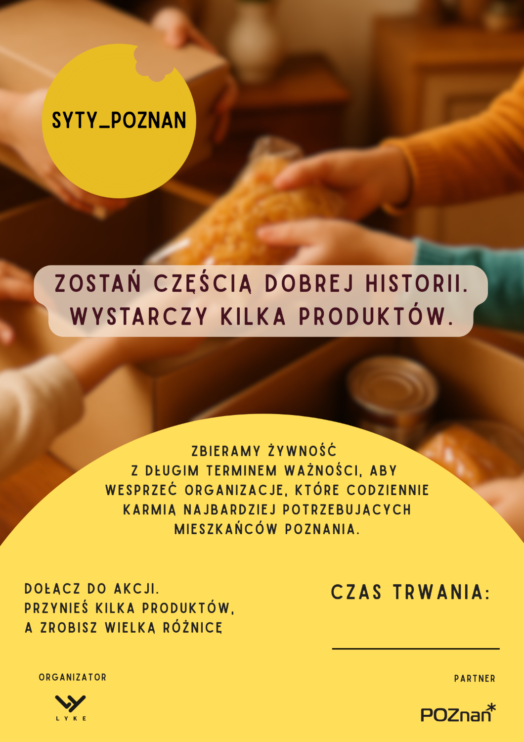 Nasza szkoła kolejny rok bierze udział w Kampanii Syty Poznań. W październiku organizujemy zbiórkę żywności o długim terminie ważności np. kasze, makarony, konserwy, koncentraty, groch, fasole, przyprawy, herbaty, kawy itp.