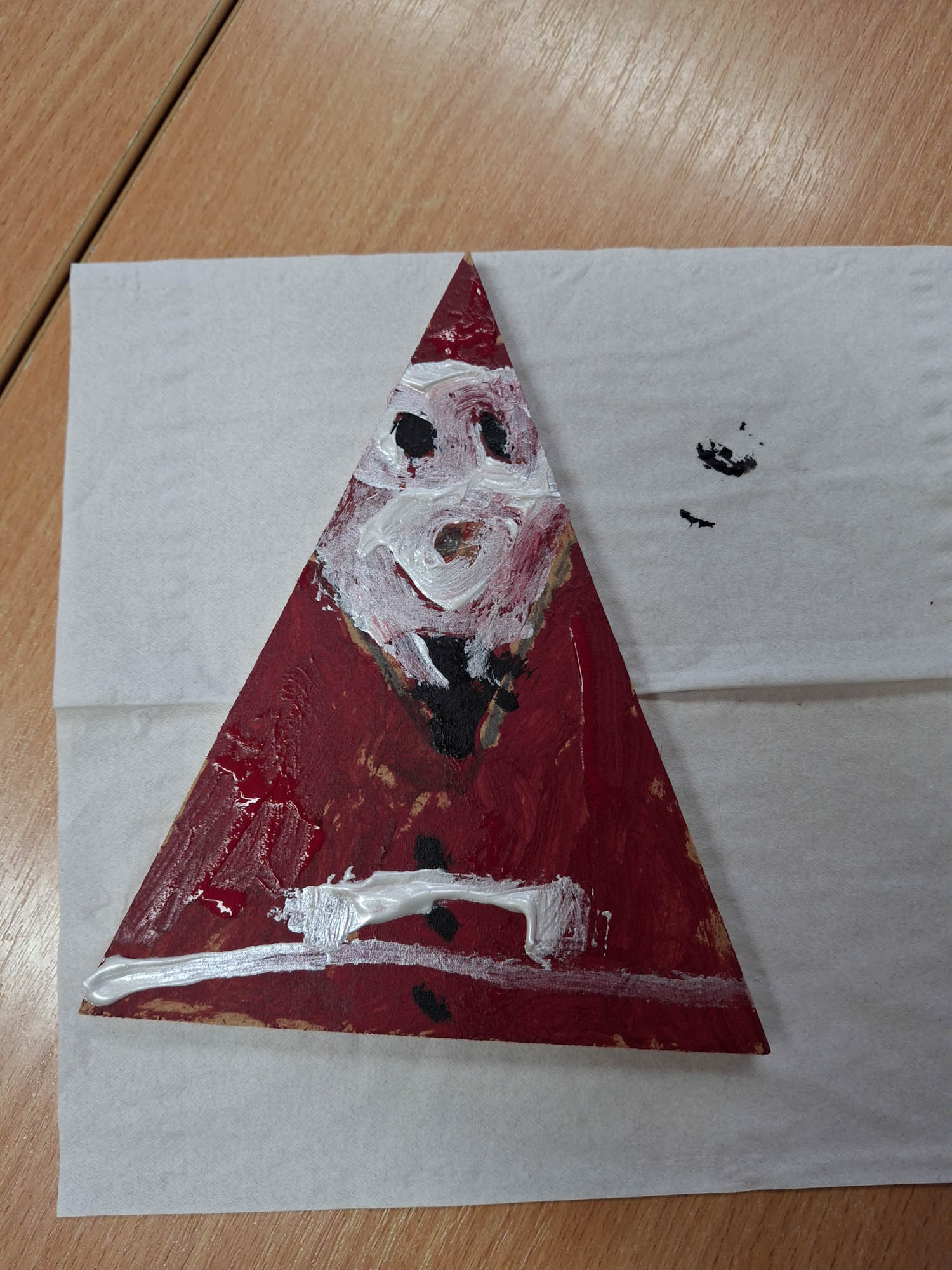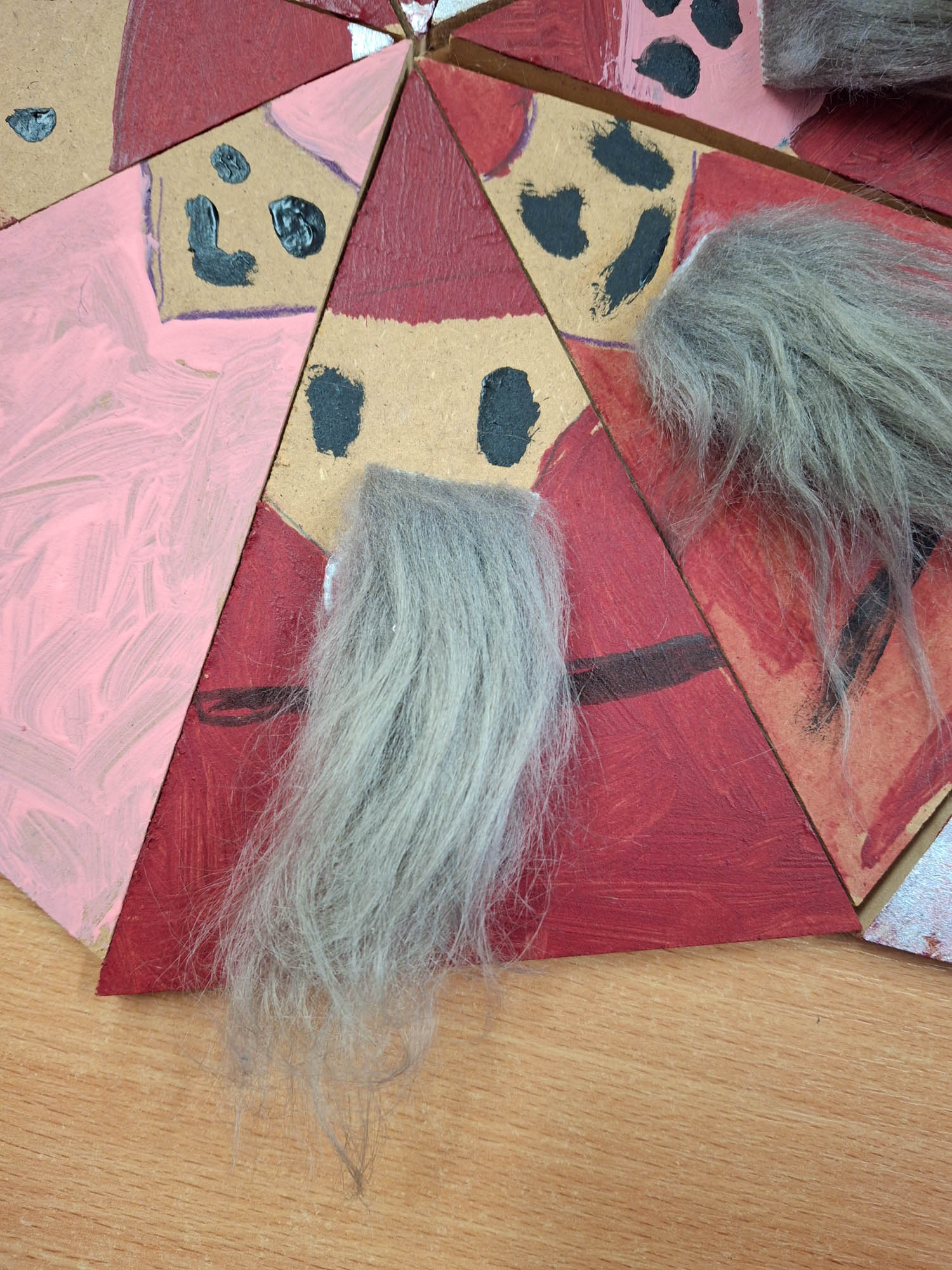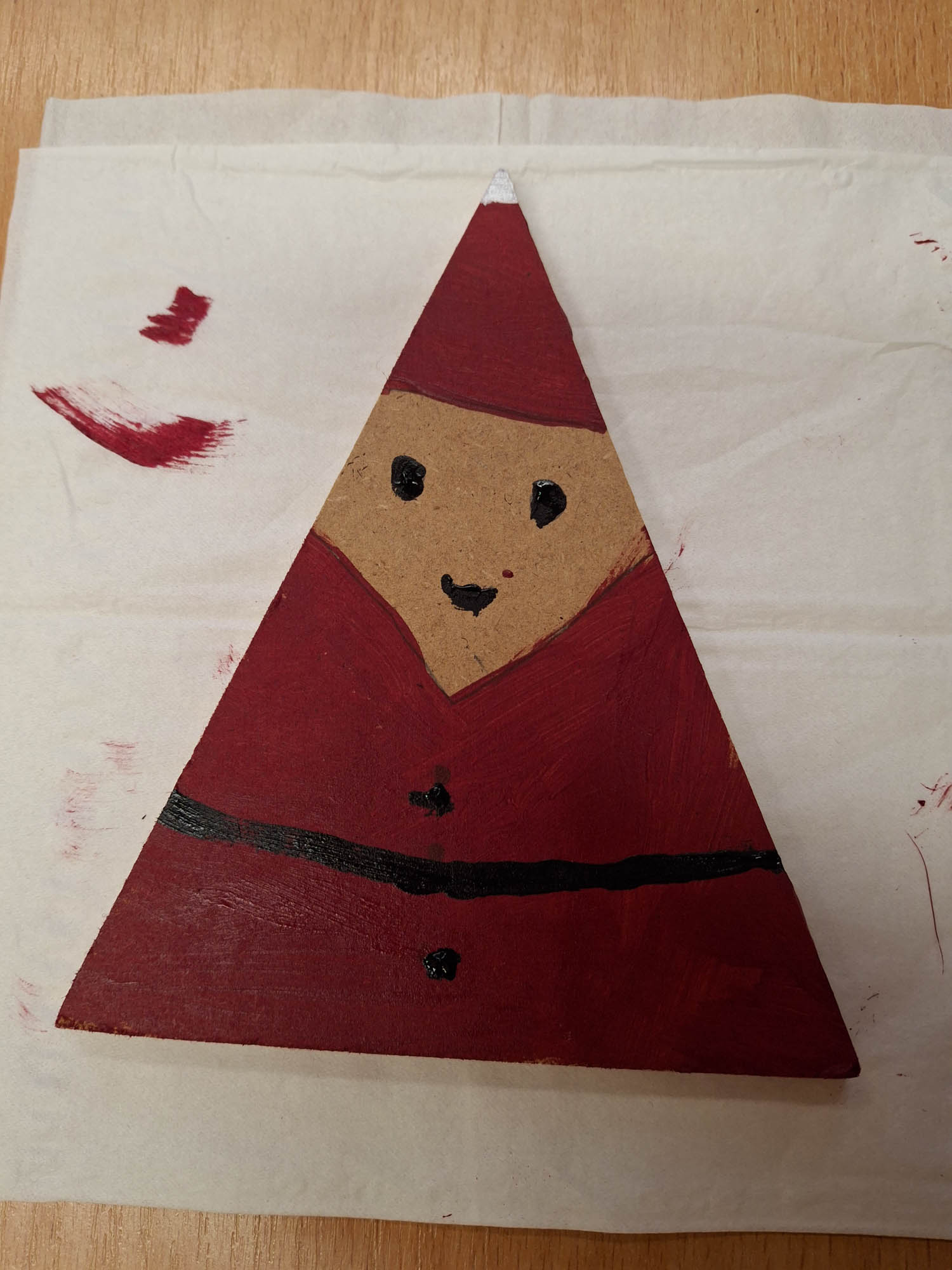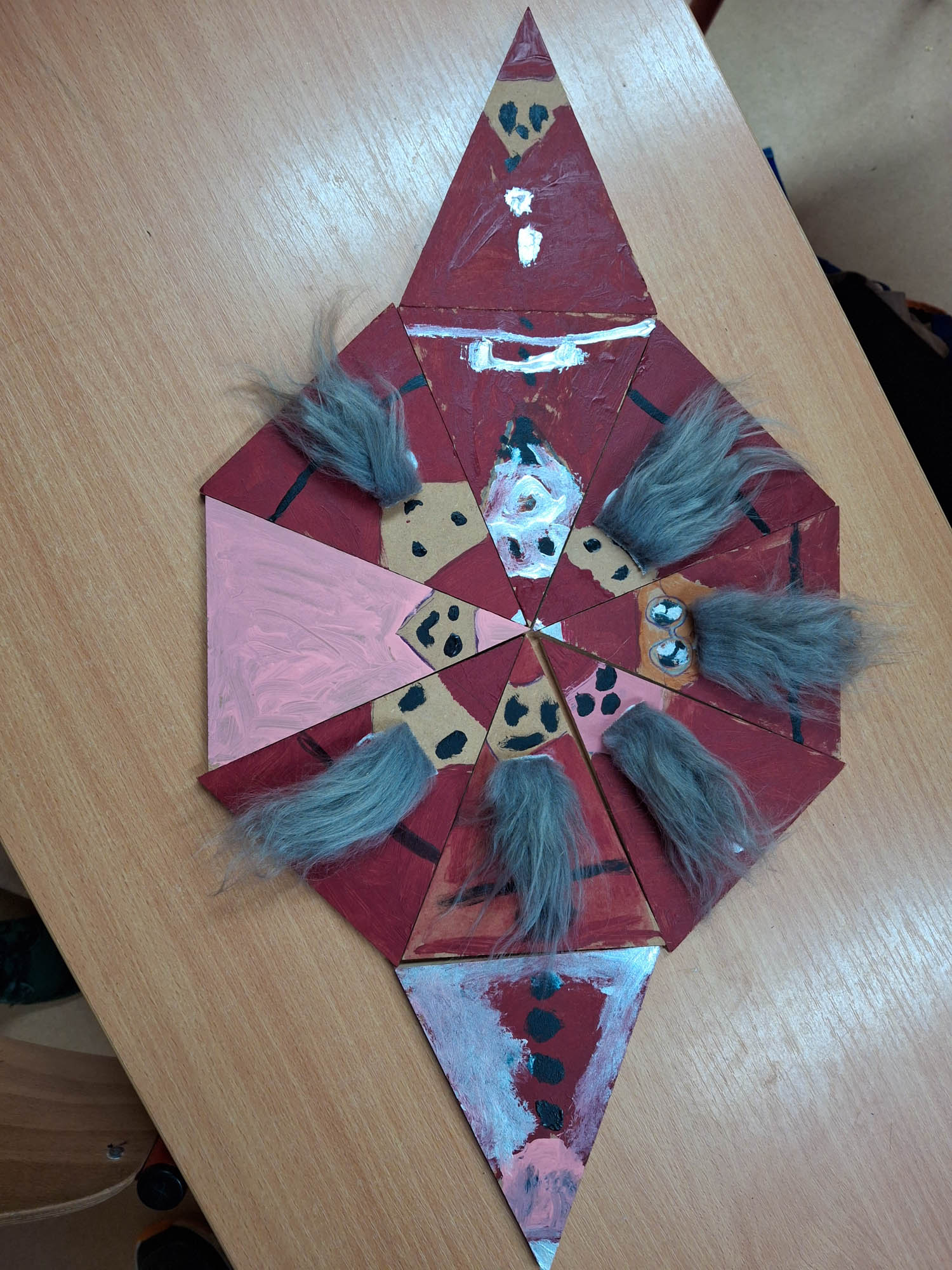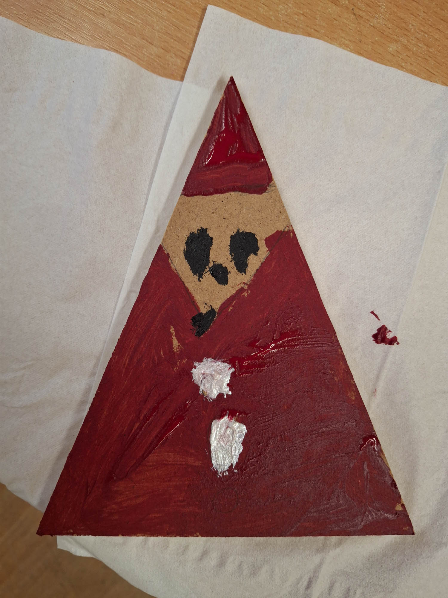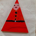 Czy z trójkąta można zrobić Mikołaja? Można! I tak w świetlicy zwykły kawałek drewna zamienił się w Mikołaja. Niektóre mają futerkową brodę, a inne namalowaną. Piękne, wyjątkowe Mikołaje.
