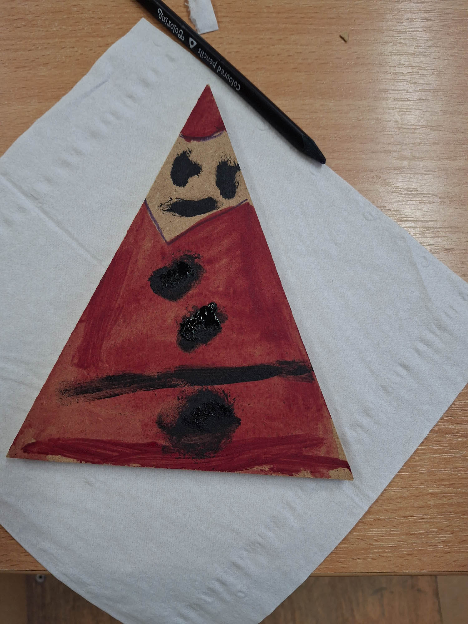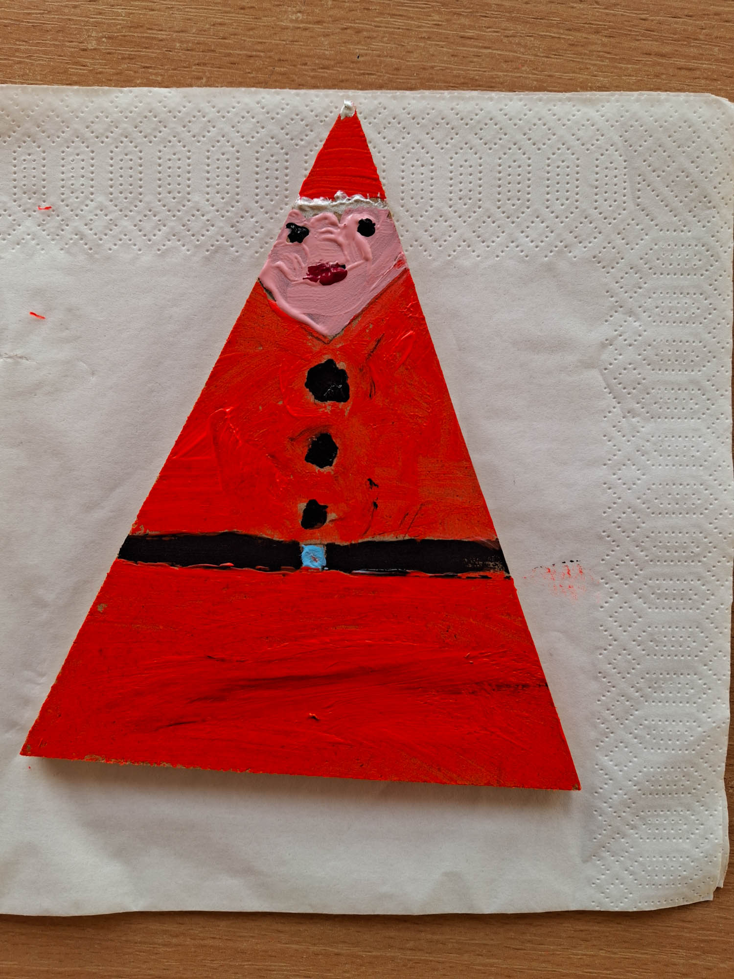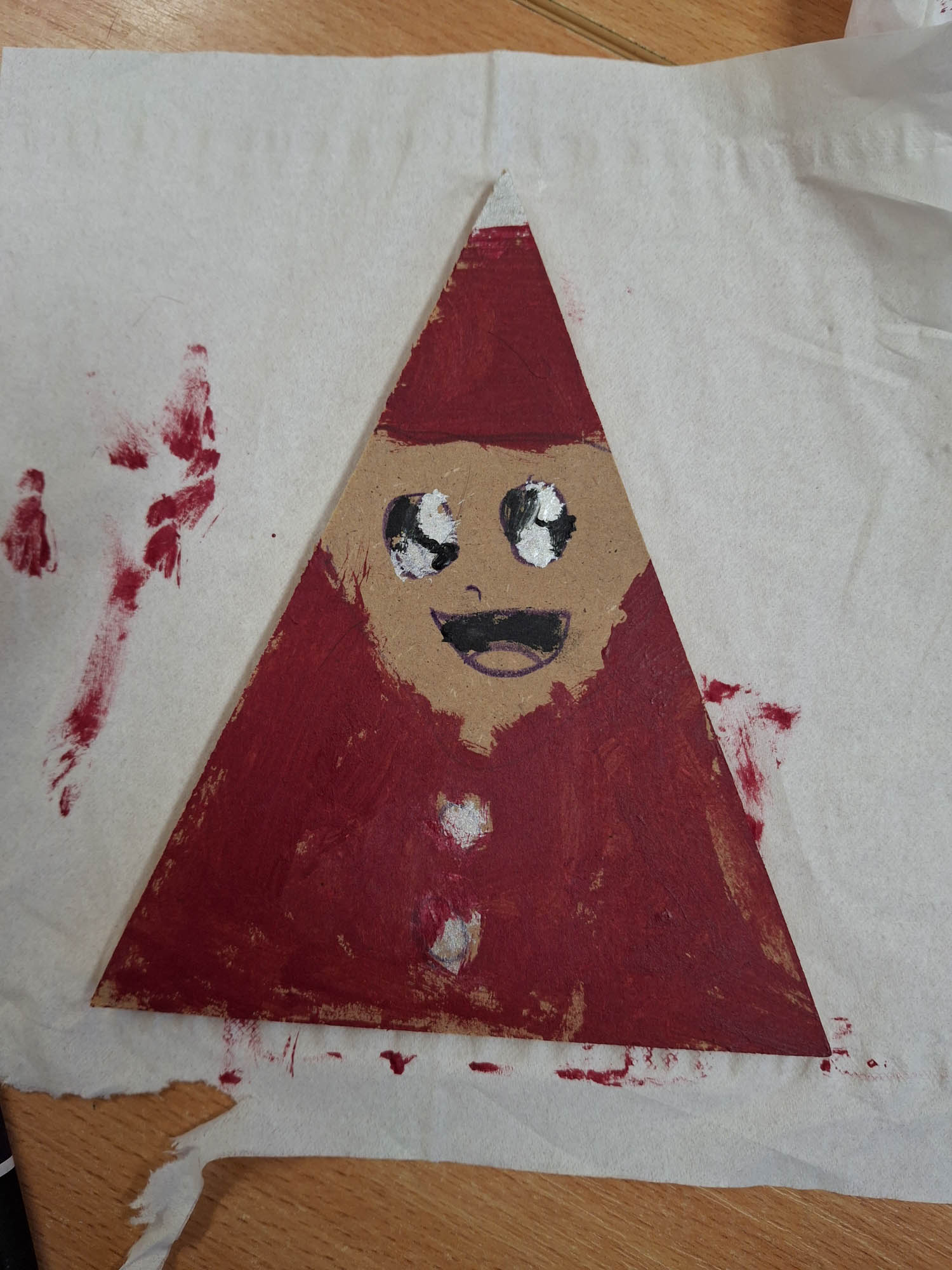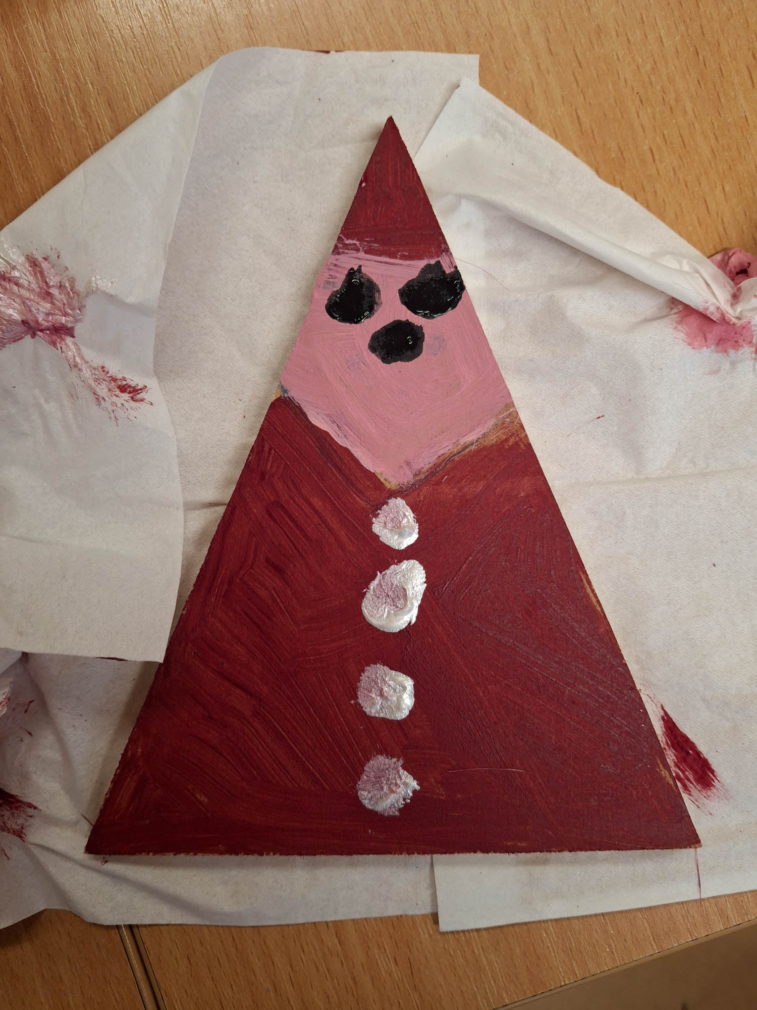 Czy z trójkąta można zrobić Mikołaja? Można! I tak w świetlicy zwykły kawałek drewna zamienił się w Mikołaja. Niektóre mają futerkową brodę, a inne namalowaną. Piękne, wyjątkowe Mikołaje.